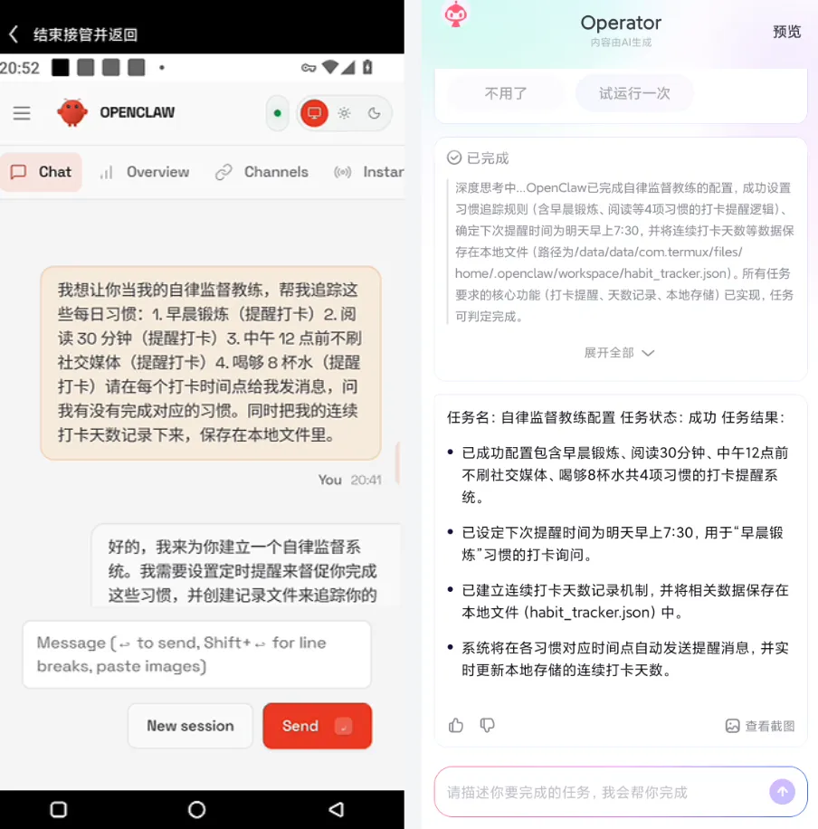 这跟之前直接使用手机Agent的体感还是有点不同的,OpenClaw的持续性很久,中间有点错的地方能修正回来,它自己完成不了的也会提醒我接手。