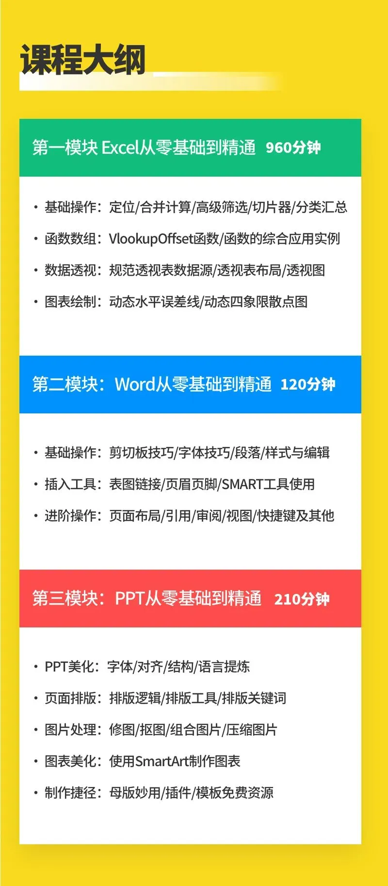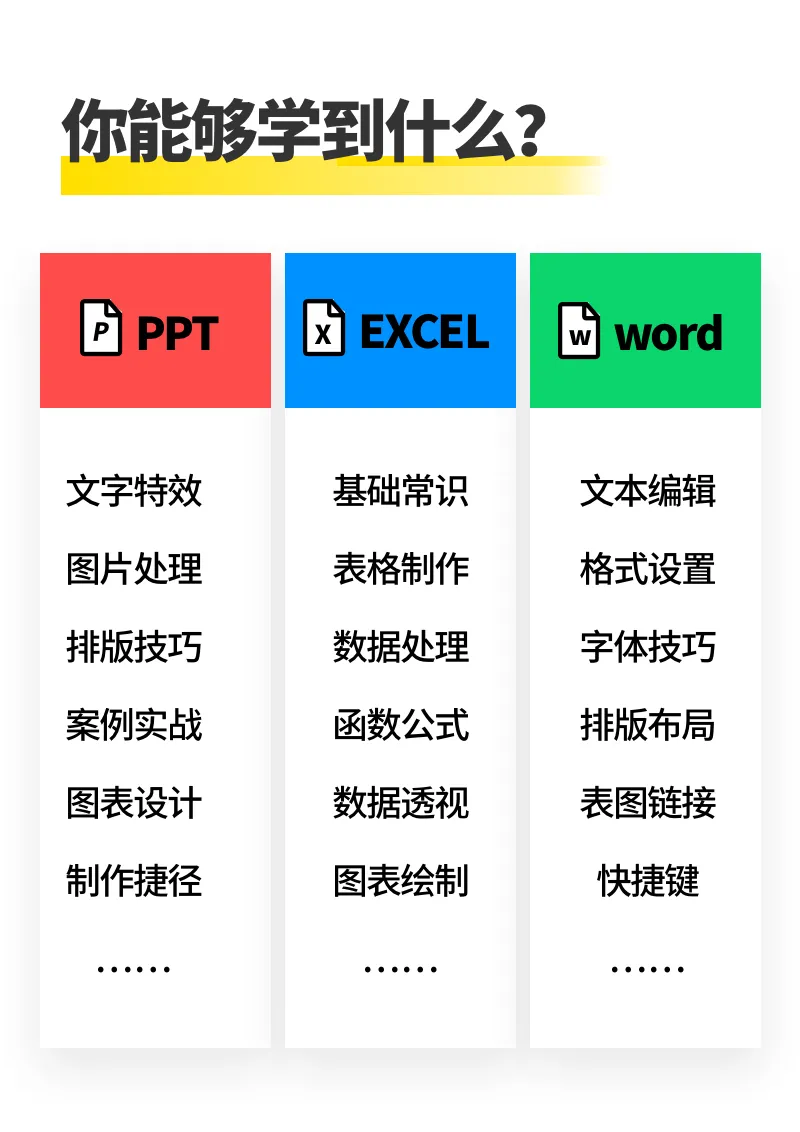 课程包含了office办公软件Word,Excel,PPT的教学,系统、详细的带你学习办公软件的使用,帮助职场人提高办公效率。具体课程内容可以查看下方课程大纲。