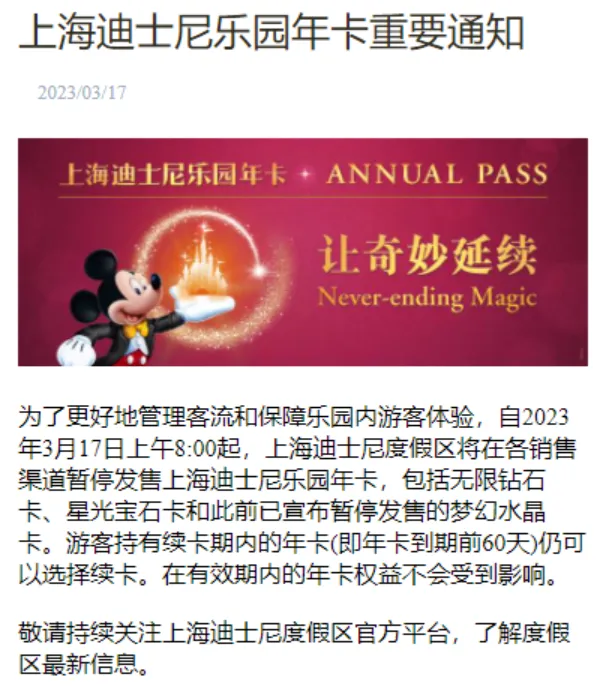 36氪获悉,据上海迪士尼乐园年卡小程序消息,上海迪士尼乐园宣布:为了更好地管理客流和保障乐园内游客体验,自2023年3月17日上午8:00起,上海迪士尼度假区将在各销售渠道暂停发售上海迪士尼乐园年卡,包括无限钻石卡、星光宝石卡和此前已宣布暂停发售的梦幻水晶卡。游客持有续卡期内的年卡(即年卡到期前60天)仍可以选择续卡。在有效期内的年卡权益不会受到影响。