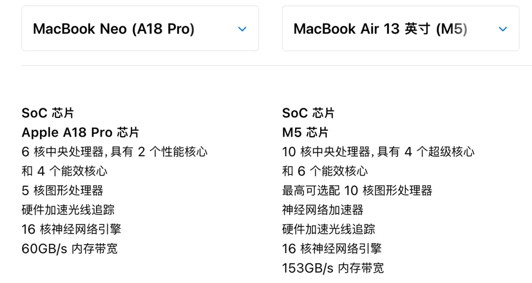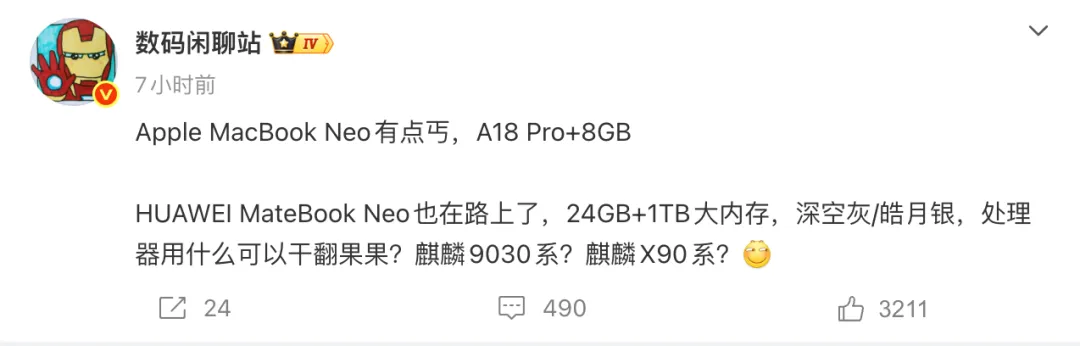 硬刚苹果,华为也要出Neo版电脑团友们,苹果在2026年 3 月 2 日 - 4 日开启 “三日连更”,集中发布了iPhone、iPad、MacBook三大产品线新品,包括iPhone17e、iPad air(M4芯片)、MacBook Neo等产品,多款新品是加量不加价,升级了配置但价格没有涨价,进一步巩固入门级产品市场。比如iPhone17e,升级了3nm工艺的A19芯片,基带为C1X,起步内存升级为256GB起步,完整支持 Apple Intelligence,价格还更低,iPhone17e 的256GB版本 仅 3999 元,比 16e 128GB 版本还便宜 500 元。另外,MacBook Neo是苹果最新推出的入门级苹果笔记本电脑,是苹果史上最便宜的笔记本电脑,售价 4599 元起,还有教育优惠直降 600 元低至 3999 元起,如果叠加国补和教育优惠 3399 元起。不过MacBook Neo便宜有便宜的原因,对比macbook Air(m5芯片),它的配置降低了不少。首先是芯片,MacBook Neo使用的是A18Pro芯片,相当于苹果M1芯片水平,跑分结果显示A18Pro芯片单核更强,多核 / GPU 略弱于 M1,但远低于 M2/M3/M4。另外MacBook Neo的内存只有8GB,屏幕也弱一点,没有光感键盘等等,整体的配置还是比较入门的,比较适合学生党、日常办公使用。面对苹果推出的低价MacBook Neo,国内厂商也不甘示弱,根据博主@数码闲聊站的透露,HUAWEI MateBook Neo也在路上,采用24GB+1TB的大内存。不过处理器没有透露,但通常来讲,要干过苹果,需要在配置上提升一波,价格适中,这样效果会比较好。