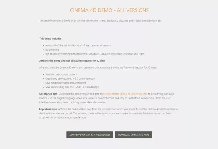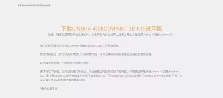 Maxon 官方给大家提供了R19的试用版本,试用版可以使用R19版本的所有功能,试用时间为42天。下载方法也非常简单,只需填写姓名、地区以及邮箱即可进行下载,大家也可以根据自己的系统平台自行选择下载相应的安装包。(支持Windows 和 macOS 系统)