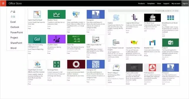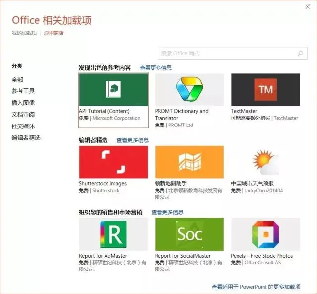 点击【应用商店】,会弹出一个应用程序库,在这你能下载到各种各样的第三方插件。是的,就相当于Office版的App Store!