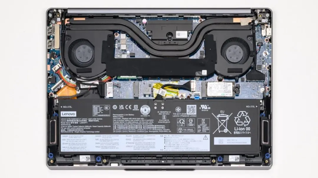 上图是小新Pro14 2024的拆机实拍图,双风扇双热管的组合,同时风扇内侧有开口,和2024款的Y7000P、ThinkBook14+一样采用了“内吹”结构的轻薄本。