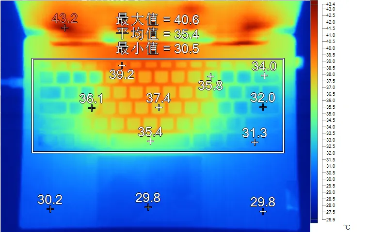 表面温度如上图所示,键盘键帽最高39.2℃出现在“F5”,WASD键为36.1℃,方向键31.3℃。左腕托温度为30.2℃,背面中心点34.5℃。