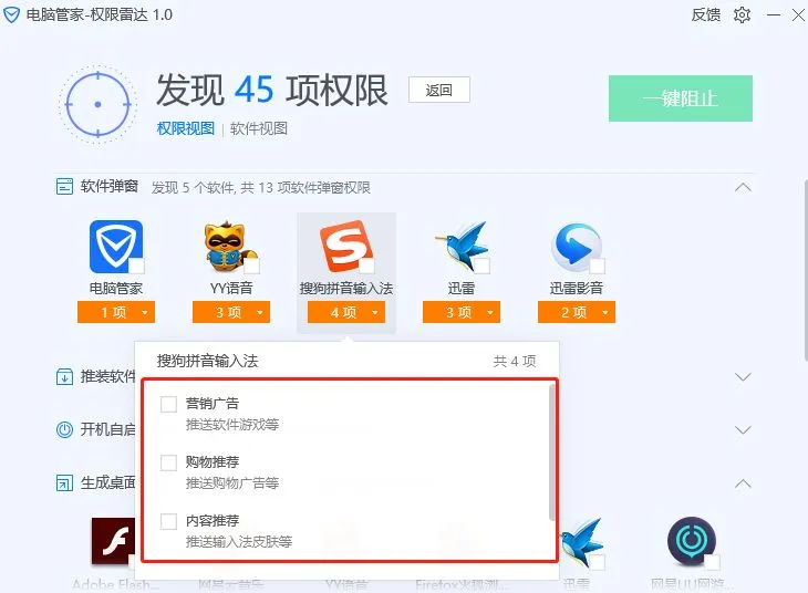 当然,除了软件行为日志,弹窗广告、开机自启问题还有捆绑下载等问题,权限雷达都能给你一一列出来。