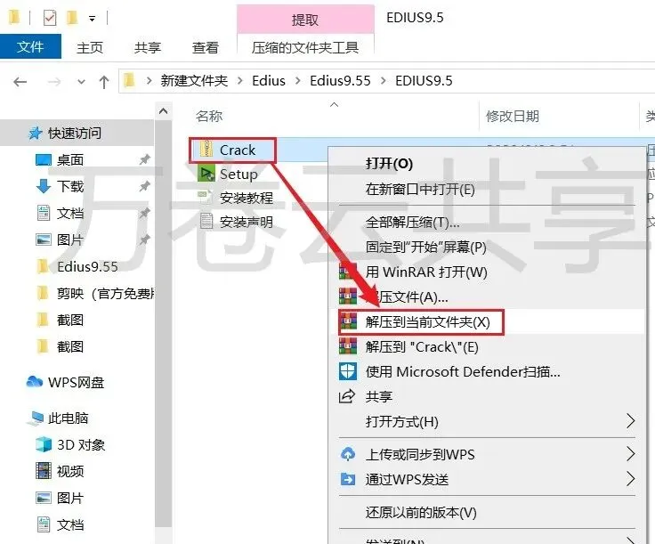 6.打开安装包解压后的EDIUS9.5文件夹,鼠标右击→Crack压缩包,点击→解压到当前文件夹