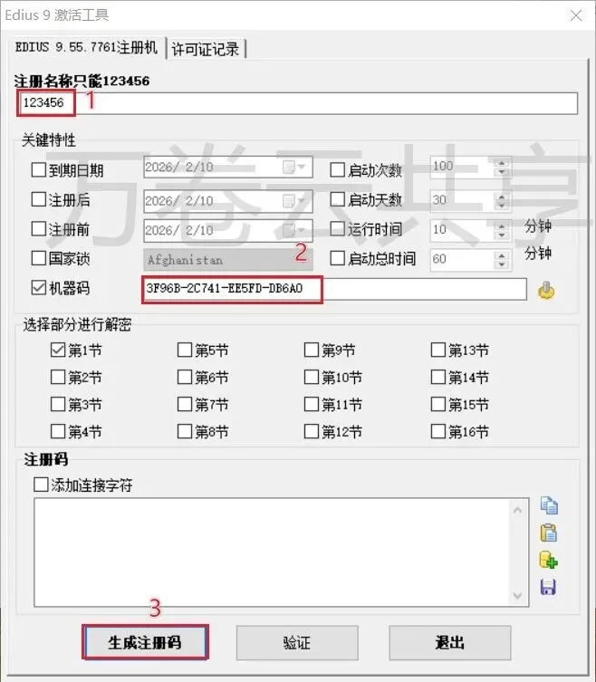 8.输入注册名称123456,粘贴→复制的机器码,点击→生成注册码