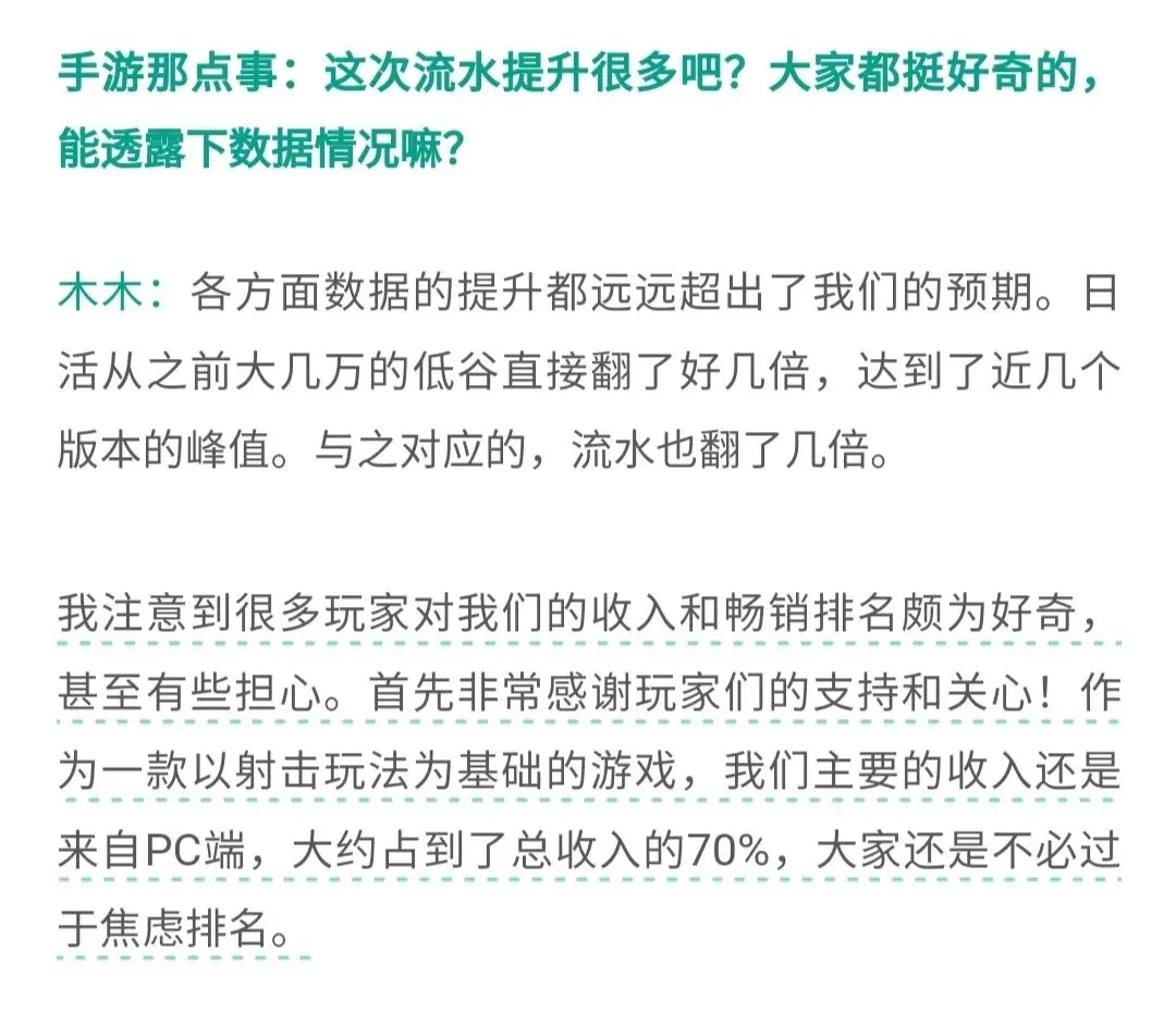 这点可以从很多玩家选择上看出,在今年2月份手游那点事专访了《尘白禁区》制作人冲冲与发行人木木,在关于流水问题上木木透露他们总收入70%来自PC端。