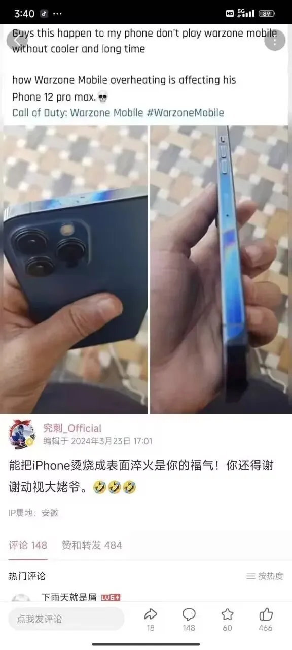 千奇百怪的三端游戏体验让我想起最近公测的使命召唤战区手游(CALL OF DUTY: WARZONE MOBILE),由于战区手游是端游暴力移植到手机端,极差的优化使得有玩家游玩时候手机被“烧”了。