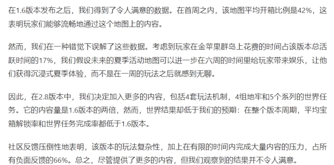 李轶轩说,在1.6版本夏活限时地图中,金苹果群岛的宝箱开启比例达到为42%这个满意的数据。于是制作组在2.8版本限时夏活中更新了几乎1.6两倍的内容量,结果关于这次活动负面反馈达到了66%。