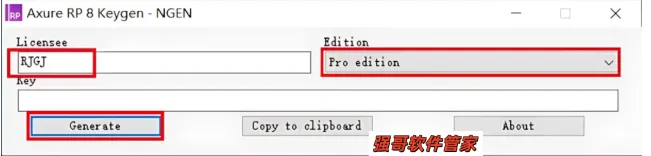 14.在License处输入【RJGJ】,Edition选择【Pro edition】,点击【Generate】,点击【Copy to clipboard】。(此页面不要关闭)