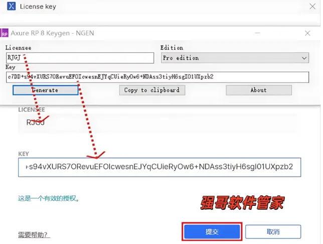 将步骤14注册机上的“Licensee“和“Key“中的内容分别复制到软件管理授权界面上的“LICENSEE“和“KEY“栏中,点击【提交】。(可以使用快捷键复制"Ctrl+C"和粘贴”Ctrl+V”)