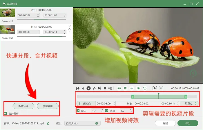 3. 录制完成后,要是你需要对视频做后期处理,点击【高级剪辑】按钮就行,在这个页面里,用户可以对视频分段剪辑或者添加效果,不用再额外把视频导入别的剪辑软件。