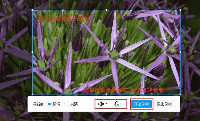 在录制参数配置中,选择需要录制的声音来源,系统声音和麦克风声音均可按需选择。待录制区域与音频设置全部核对无误后,点击“Record”或“Start”按键开始录制。