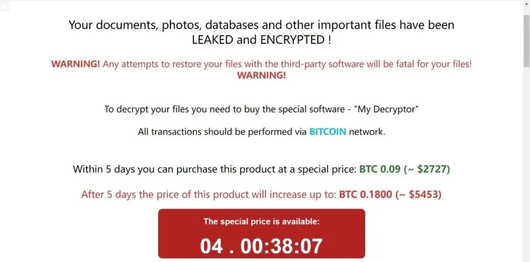 我的重要文件全被加密了,修改文件会损坏文件,必须向对方购买解密软件才能解开,5 天内需支付 0.09 比特币(约 2727 美元,大概是人民币 18845 元),5 天后涨至 0.18 比特币(约 5453 美元,大概是人民币 37582 元)。