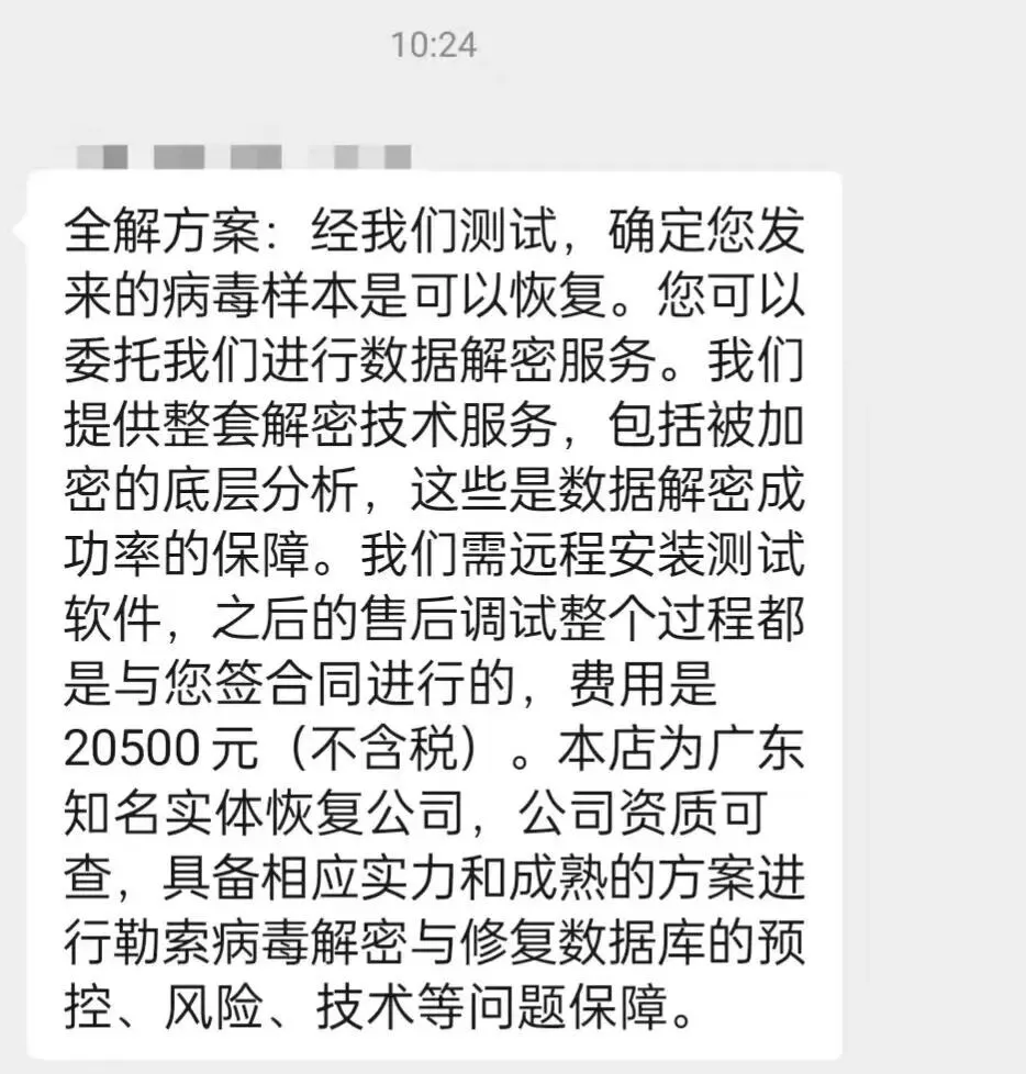 3.询问专业人士。发邮件询问但是没有回复;联系专门的安全公司的技术人员,要么说解不了,要么说可以解,但是费用巨高,2 万多(一度怀疑是一伙的),比黑客给的价还高,对方还给我看了解密的效果,确实能解密,但是价格过高了。最后有一个比较实诚的技术人员说这种勒索病毒是最新的,目前没有免费的解密器,赎金过贵,还是等待几个月出了免费的解密器再来。