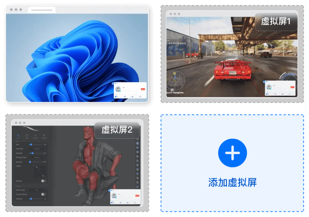 简单来说,虚拟屏就是 ToDesk 在你的被控端电脑里,多加了几个虚拟的屏幕/窗口,你可以把不同的软件、任务分到新加的虚拟屏里展示或操作。