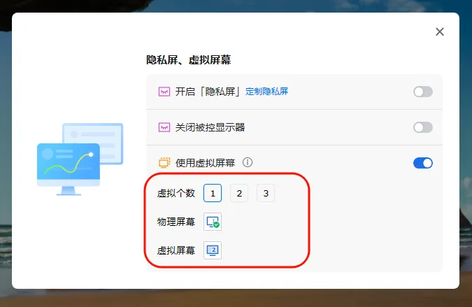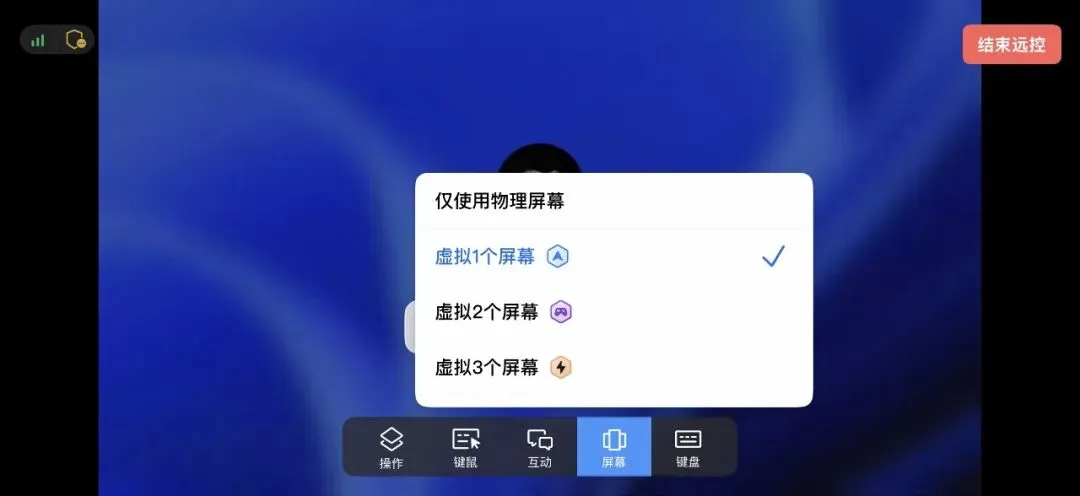 远程到被控设备后,点击悬浮窗菜单栏-「隐私屏 & 虚拟屏」,可以选择虚拟1-3个屏幕,被控设备即可开启多屏体验。