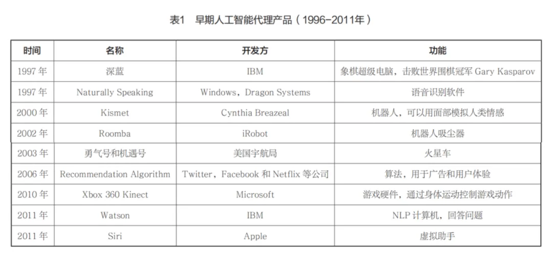 1997年,由IBM开发的超级电脑“深蓝”(Deep Blue)击败世界围棋冠军加里·卡斯帕罗夫(Gary Kasparov),成为首台在“人机对战”中战胜人类象棋冠军的机器。“深蓝”的对弈决策在通用超级计算机处理器和480颗特制的VLSI象棋加速器芯片的支持下完成,前者的软件只执行部分象棋运算,后者则处理更复杂的棋步。尽管后来遭到质疑的IBM拒绝与卡斯帕罗夫再战,但人工智能也已经能够在“有完全信息的组合游戏”中击败人类。根据“摩尔定律”(Moore’s law),计算机芯片的性能平均每隔18个月就会翻一番,与之并驾齐驱的是突飞猛进的计算机软件。由此可以推论,由软硬件驱动的人工智能将会不断进化。的确,尽管“深蓝”已经被IBM大卸八块,其后的人工智能代理产品却推陈出新,且功能逐渐分化,拓展至算法推荐、智能家居、虚拟助手、航空航天等领域(见表1)。