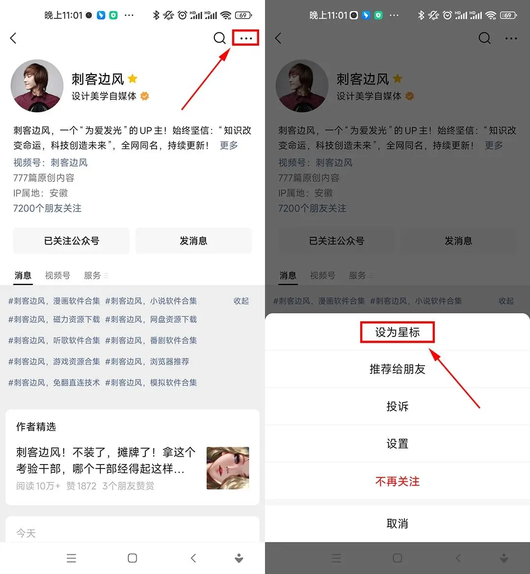 小伙伴们注意:刺客每晚20点35分准时推送。但因信息流乱序,不少人还是错过了干货!刺客建议大家把本公众号置顶(设为星标★),以便第一时间看到推送,方法如下图: