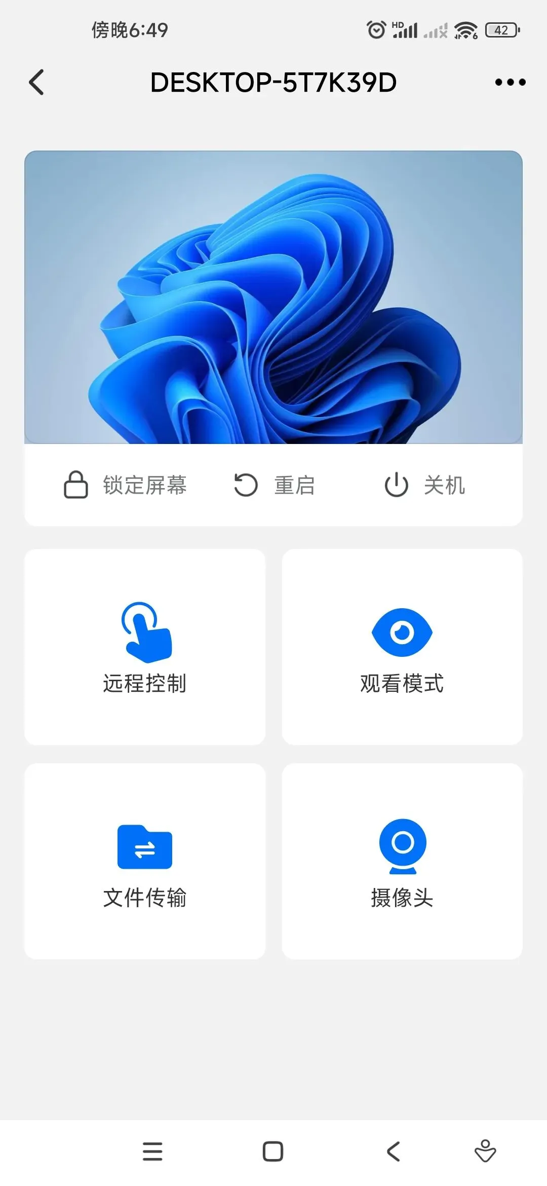之后就能够进入到操作界面。这里包括了:远程开机、关机、重启、控制、观看、文件传输,以及摄像头等等。