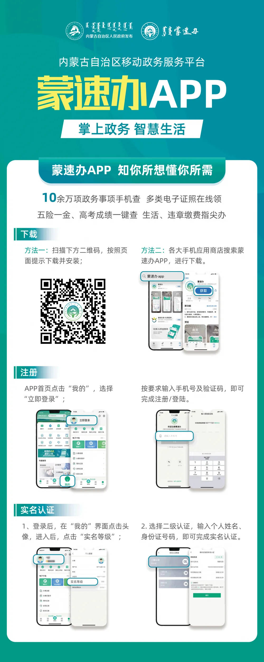 蒙速办”App是自治区人民政府打造的全区一体化在线政务服务平台移动端,由自治区、盟市、旗县三级共建共用,为企业群众提供一站式掌上查询、掌上预约、掌上办理、掌上评价的全流程在线掌上政务服务。截至目前,“蒙速办”App接入了一件事一次办、12345随手拍、政务服务地图、排队叫号、帮您办、公积金查询、市工程建设项目审批等200项政务服务特色应用。