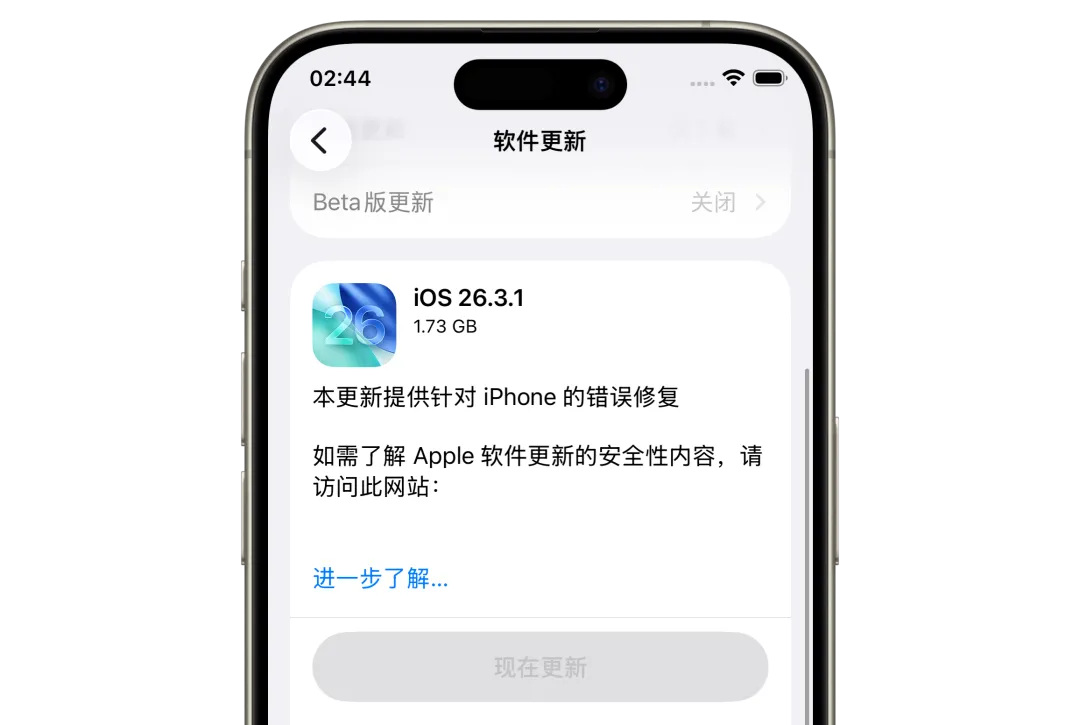 今天凌晨,苹果发布了 iOS 26.3.1 正式版,版本号为:23D8133。同时还推送了 iPadOS 26.3.1 正式版和 macOS 26.3.1 正式版。这次的更新未经公开测试,直接面向所有兼容设备发布。根据官方更新日志,这次更新主要包含针对 iPhone 的错误修复。
