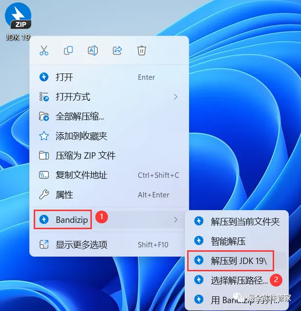 1、下载JDK 19软件安装包到电脑上,右键选择【解压到JDK 19\】