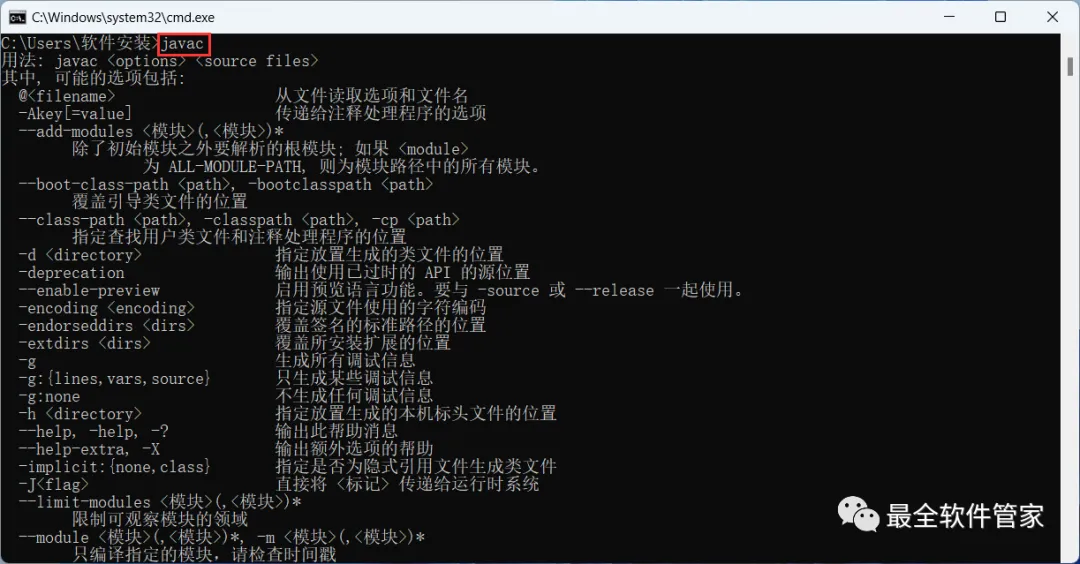 11、输入:javac,,按下键盘上的【Enter】回车键,得到下列反馈,则JDK安装及配置成功