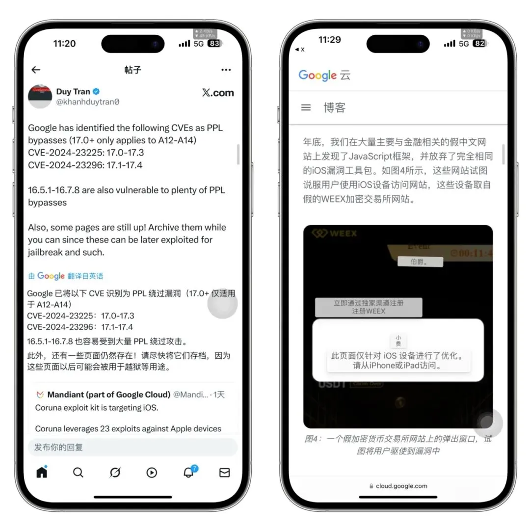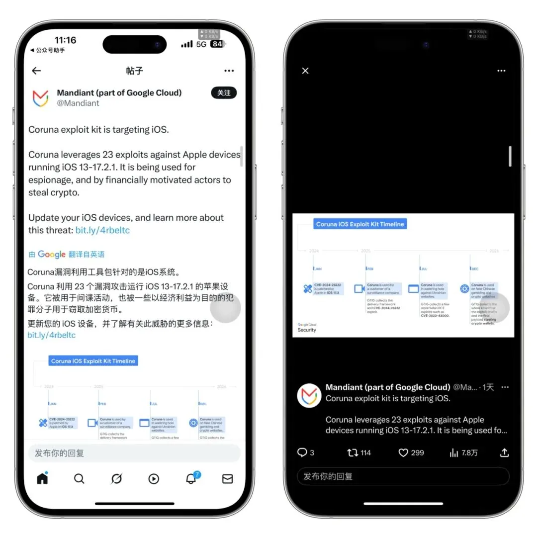 之前曝光的 Coruna 漏洞利用工具,涉及多达 20 多个漏洞组合,支持 iOS 13 – 17.2.1。