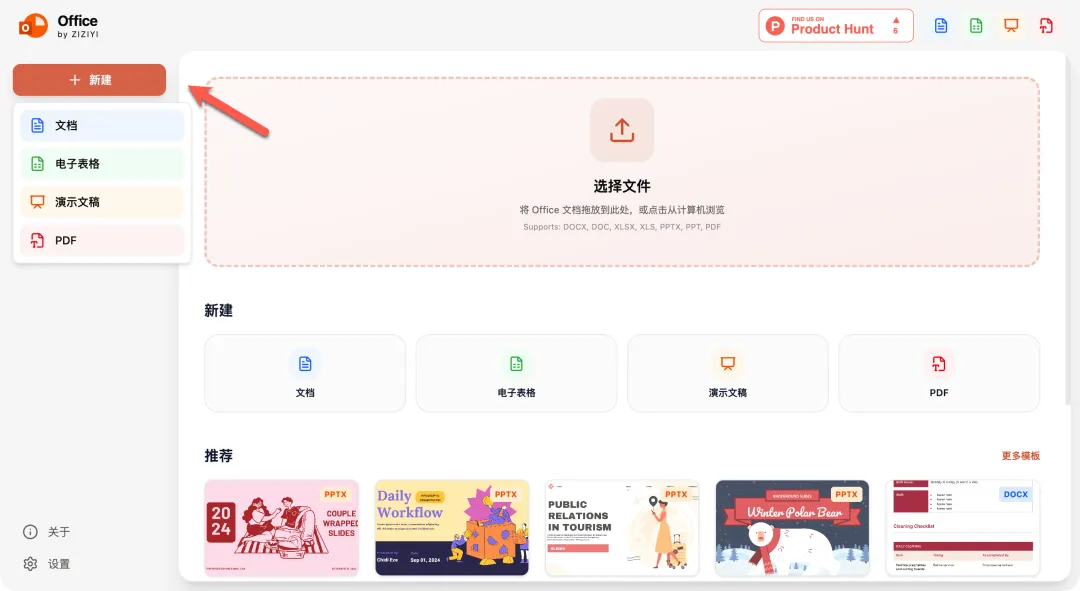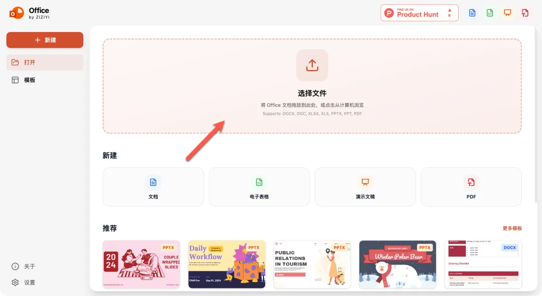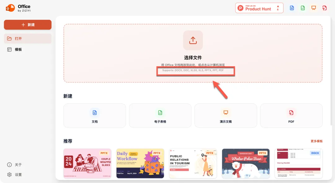 支持 DOCX, DOC, XLSX, XLS, PPTX, PPT, PDF 等文档格式