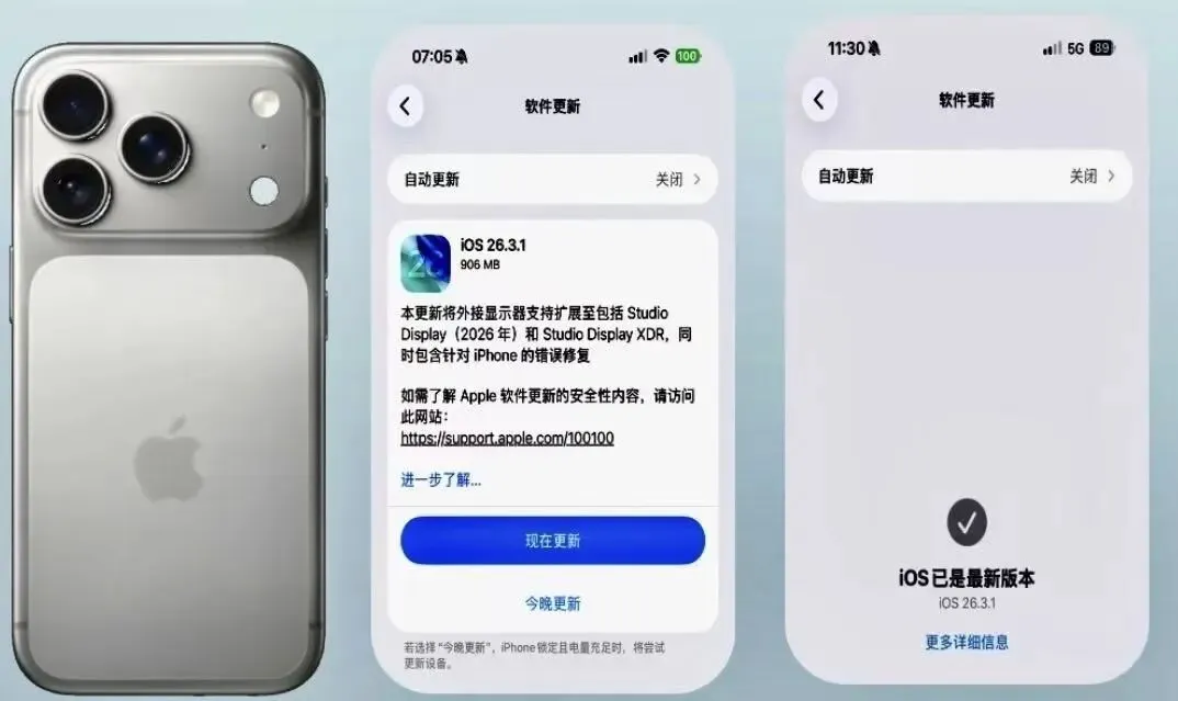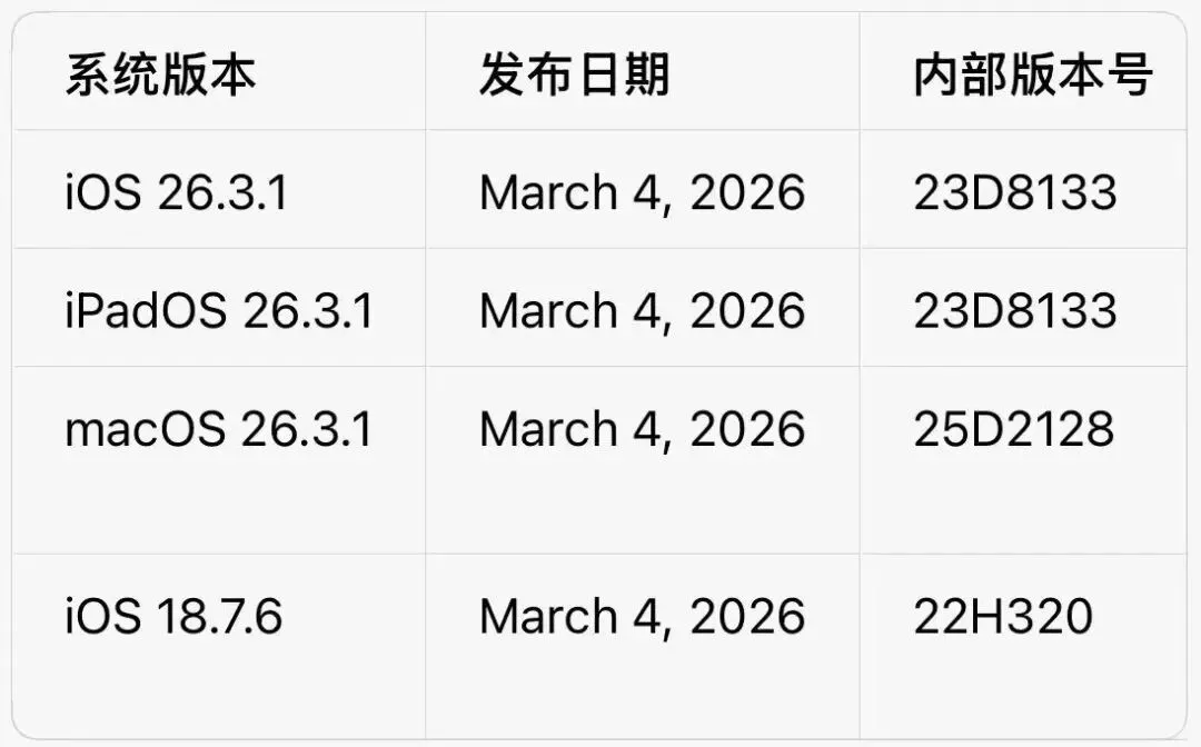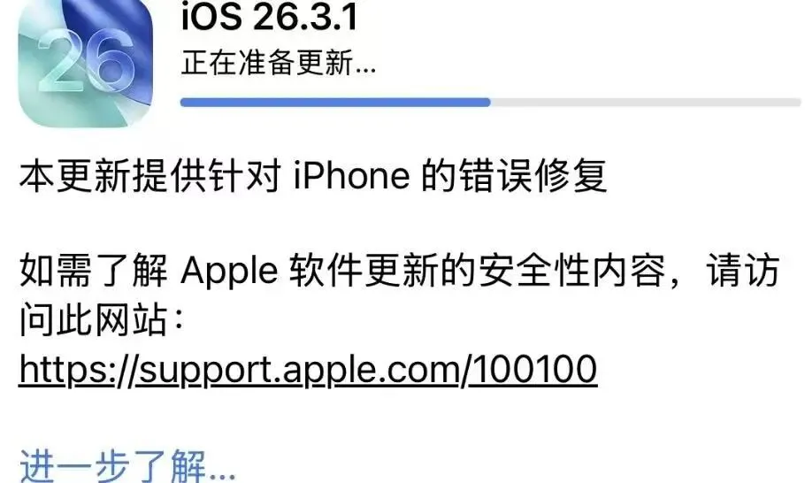苹果推送的 iOS 26.3.1 更新是一次小版本发布。