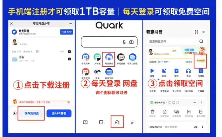 1. 手机浏览器打开官方专属链接:https://pan.quark.cn/s/b06f842656cc (复制直接打开) 2. 页面显示"新用户保存成功,立享1TB空间",点击左下角"保存到网盘" 3. 用手机号注册新账号(未注册过夸克的手机号) 4. 注册成功后,系统自动转存预设文件,触发1TB扩容机制 5. 下载夸克网盘APP,用注册手机号登录,在"我的→存储空间"查看已到账1TB