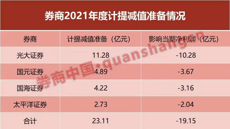 截至目前,共有4家上市券商公布了2021年度计提减值准备情况,光大证券、国元证券、国海证券、太平洋证券4家券商合计计提金额高达23.11亿元,对2021年净利润造成的冲击合计高达19.15亿元。