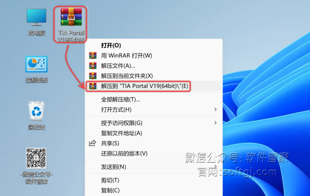 1.鼠标右击【TIA portal V19 (64bit)】压缩包(先点击“显示更多选项”)选择【解压到 TIA portal V19 (64bit)】。