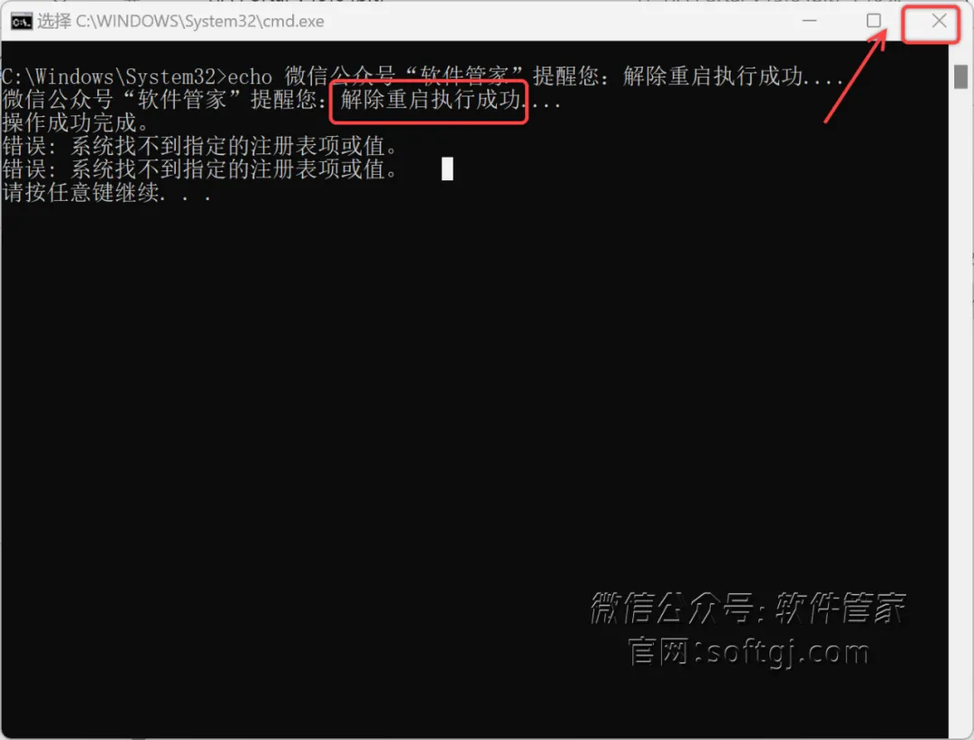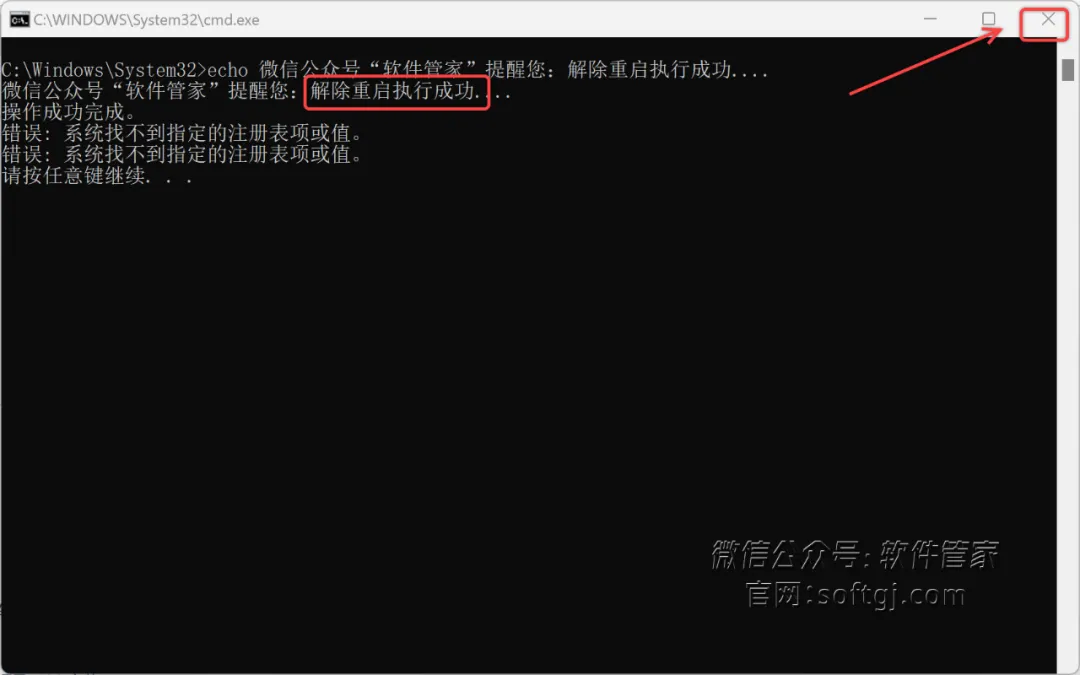 3.提示“解除重启执行成功”后点击右上角【X】退出。