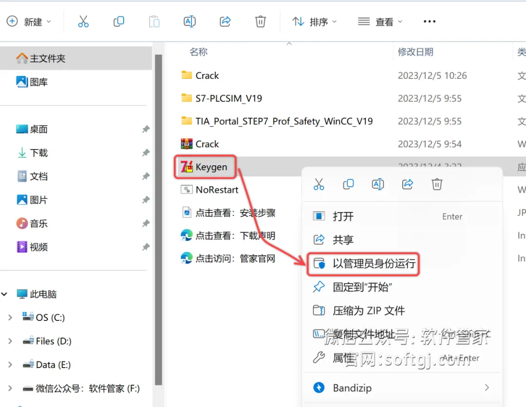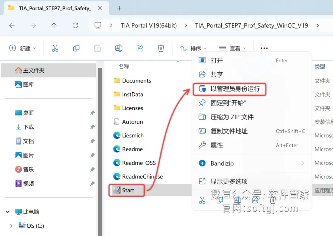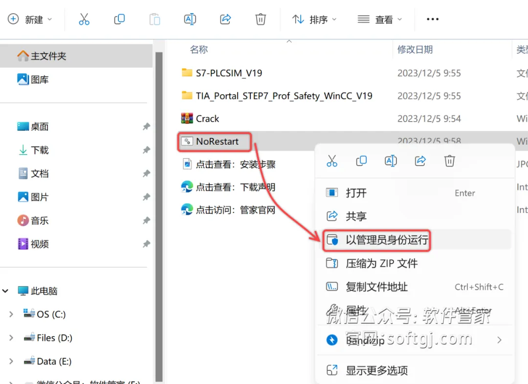 17.打开安装包解压后的【TIA portal V19 (64bit)】文件夹,鼠标右击【NoRestart】选择【以管理员身份运行】。