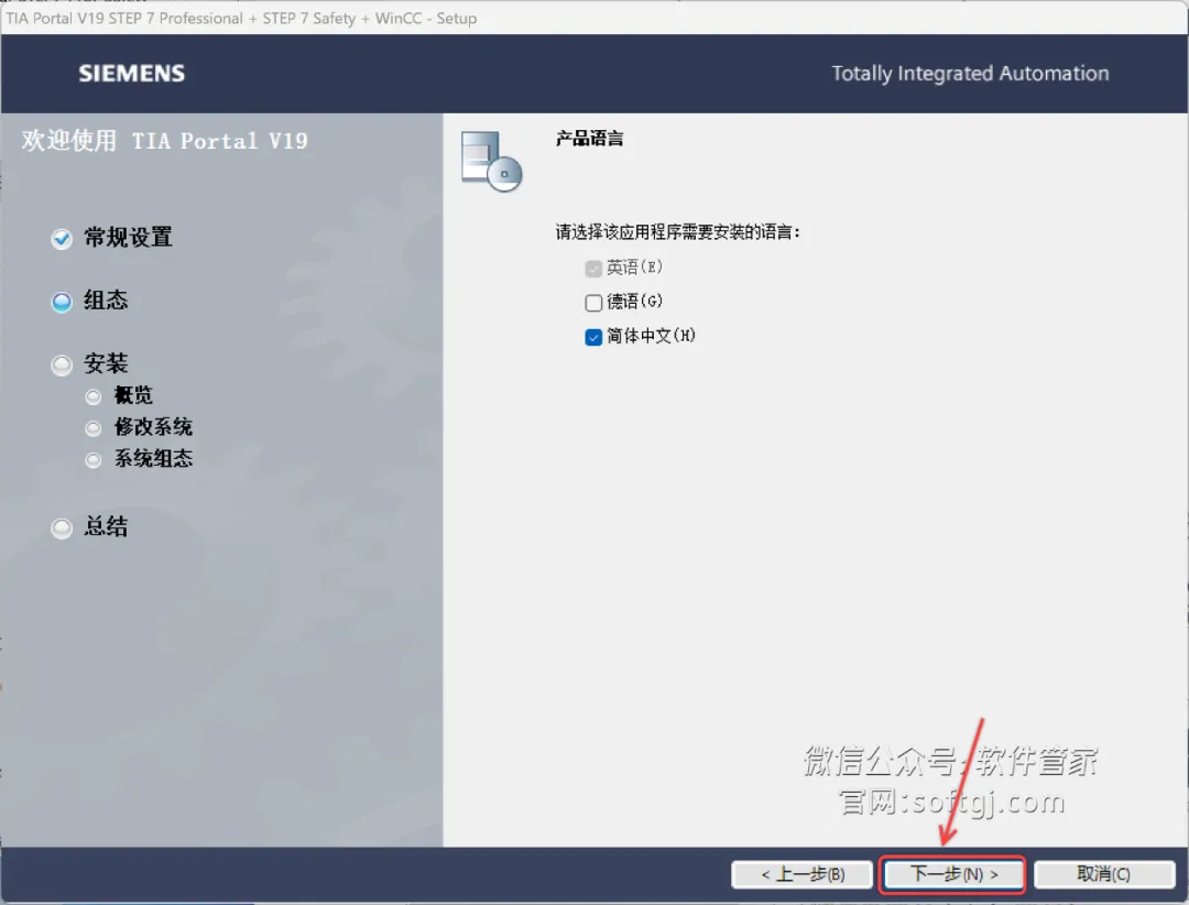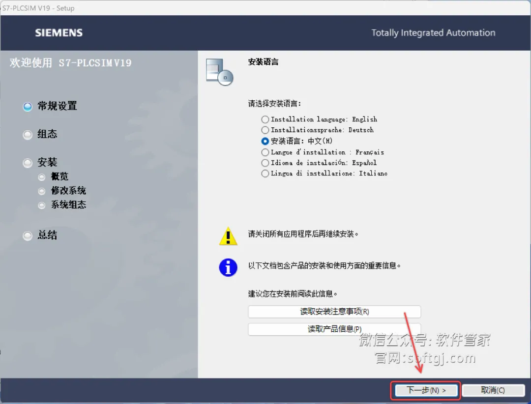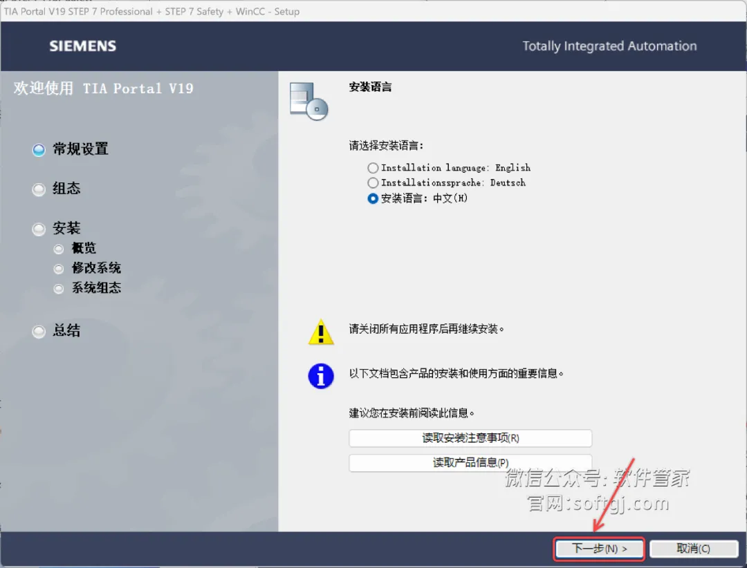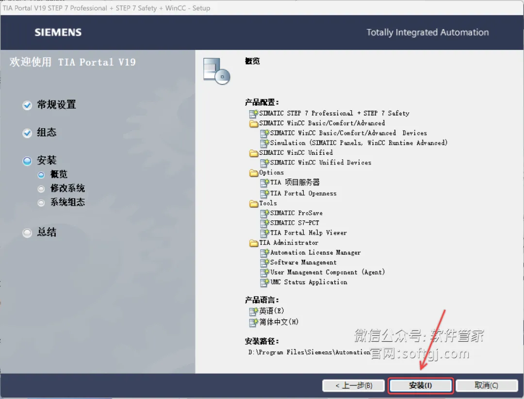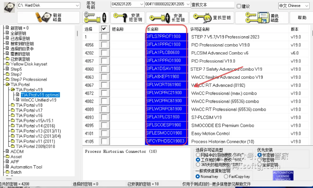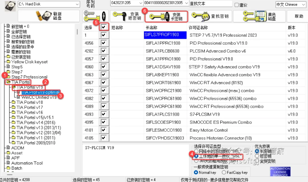 29.①双击左侧的【TIA Portal】②双击【TIA PortalV19】③选中【TIA PortalV19 optimal】④选择【工作地的单一授权】⑤勾选短名称前的【勾选框】全选产品⑥点击【安装长密钥】。