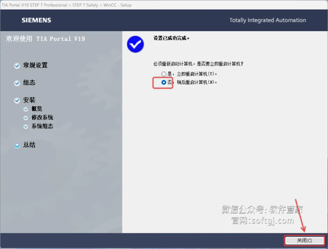 16.选择【否,稍后重启计算机】,点击【关闭】。