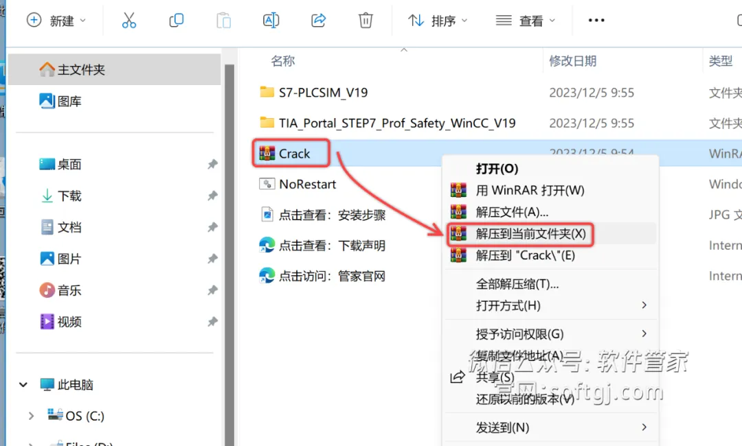 27.打开安装包解压后的【TIA portal V19 (64bit)】文件夹,鼠标右击【Crack】选择【解压到当前文件夹】。