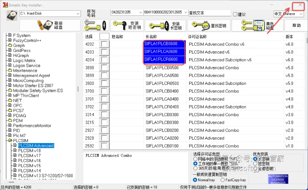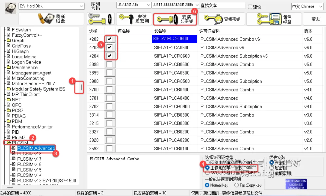31.①滑动【下拉】按钮找到【PLCSM】②双击【PLCSM】③选中【PLCSM Advanced】④选择【工作地的单一授权】⑤勾选【4202、4203、4204】⑥点击【安装长密钥】。