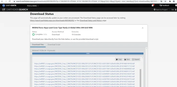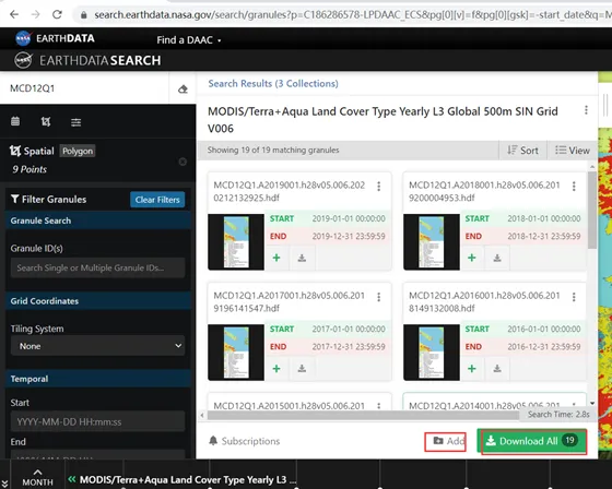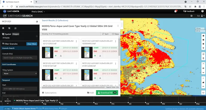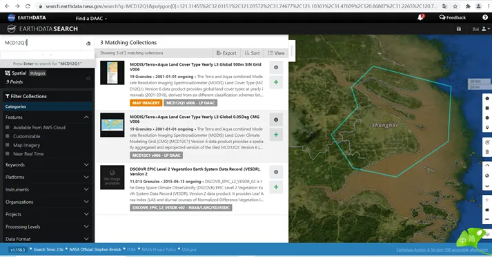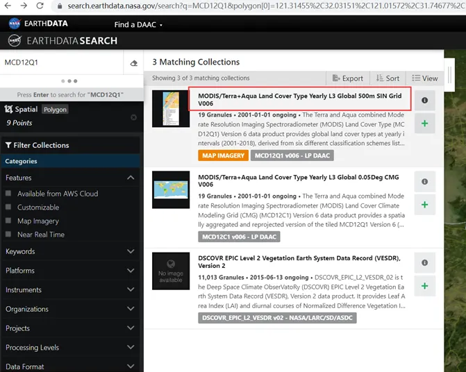 4. 在搜索框内输入需要下载的数据的名称MCD12Q1,点击enter,得到下面的界面