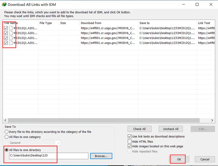 13.在弹出的界面选择四个链接,选择输出到一个文件夹,点击ok