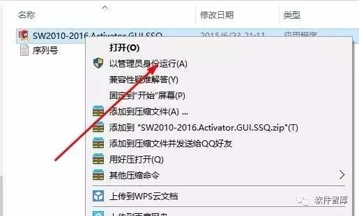 12.下面开始破解,打开破解文件夹,找到“SW2010-2016.Activator.GUI.SSQ.exe”,右击选择【以管理的身份运行】