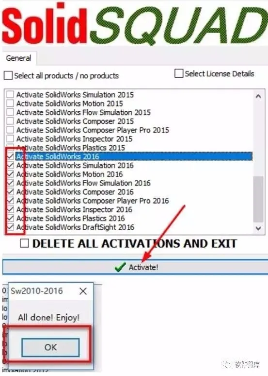 13.勾选所有Activate SolidWorks 2016项目,点击最下方【√Activate!】,弹出提示“All done!Enjoy!”,破解成功,点击【OK】