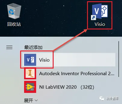 11.WIN10默认不创建桌面图标,点击左下角【开始】按钮弹出右侧程式列表中找到Visio快捷方式,鼠标左键按住不放直接拖拽至桌面生成图标,方便以后打开