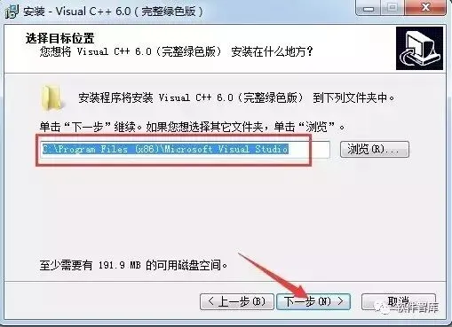 4.选择安装目录,默认安装在C:\Program Files (x86)\Microsoft Visual Studio(建议安装在除C盘以外的磁盘上,可在D盘新建文件夹VC6.0),然后点击【下一步】