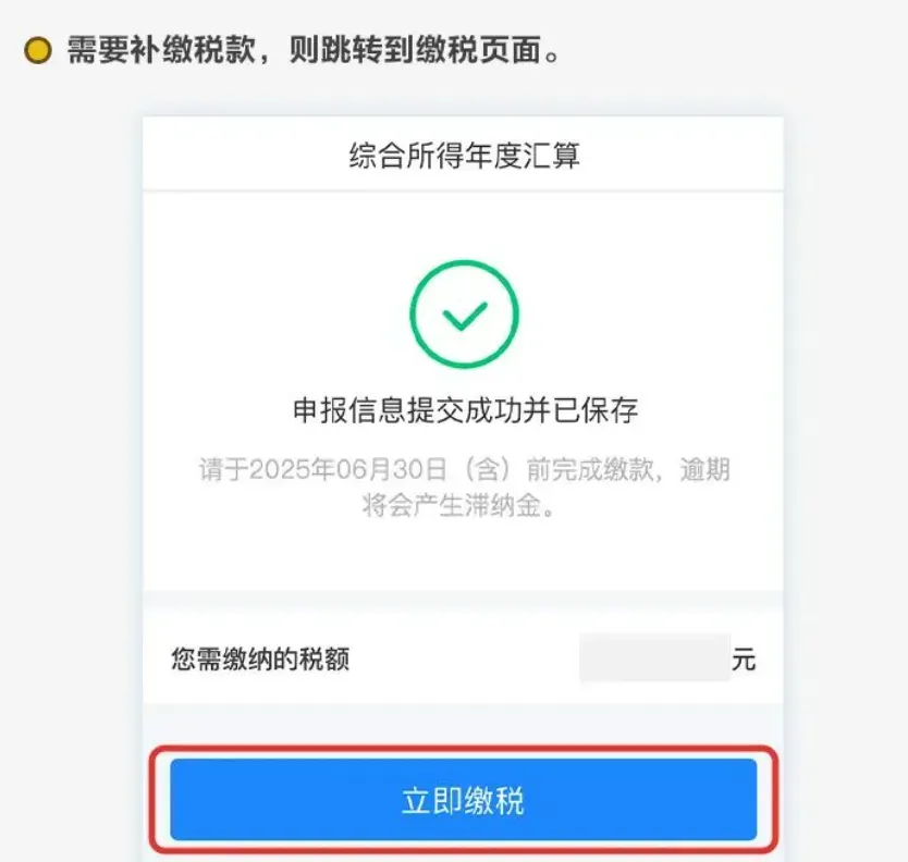 ·补缴税款:如需补缴,点击【下一步】进入应补税额页面,点击【立即缴税】。