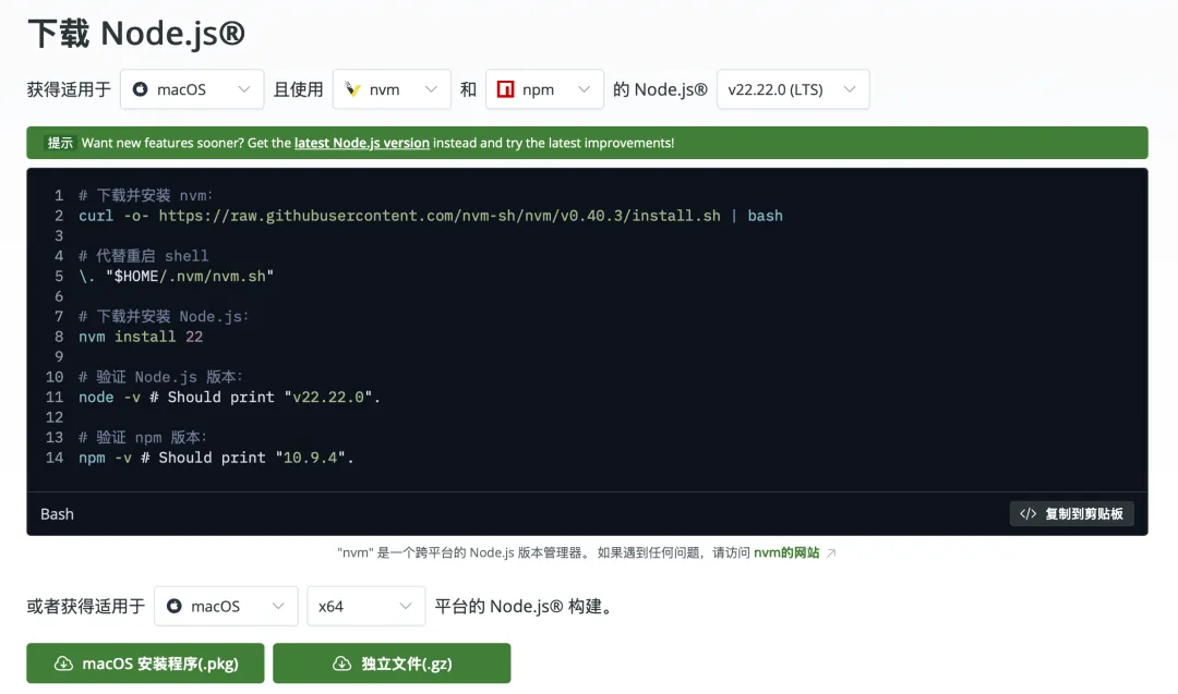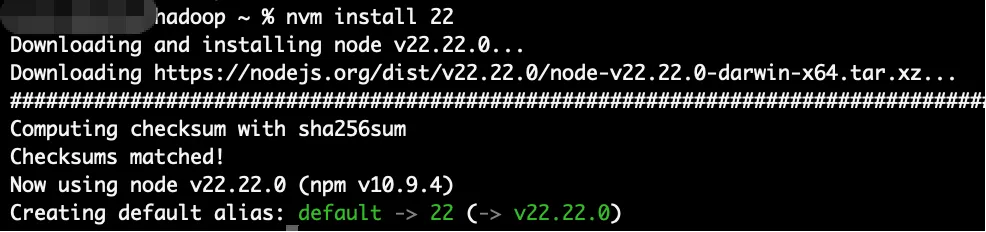 # 重新加载shell配置source ~/.zshrcsource ~/.bash_profile3. 安装Node.js v22nvm install 22