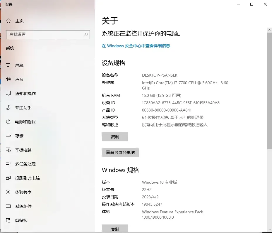 注意:这里的实测在Windows 10的环境下,如图所示我的电脑配置如下:
